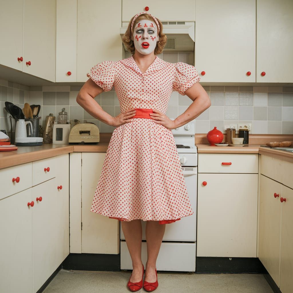 This image depicts a muscular man in 1950s housewife attire, including a polka dress and heels, standing resolutely in a kitchen with smeared makeup.