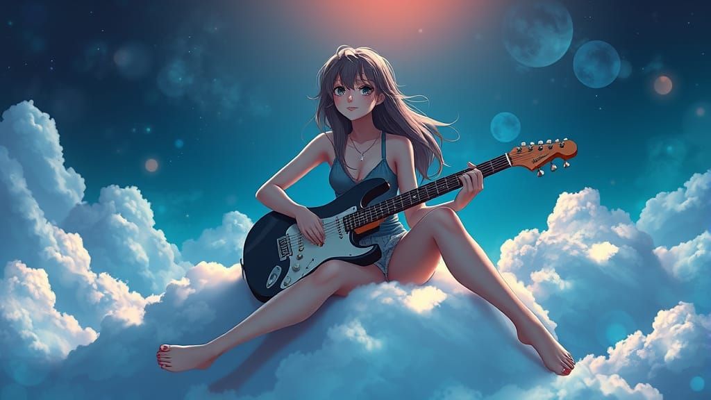 This image depicts a beautiful young woman in an animated style, sitting on a cloud and playing the guitar. The scene evokes a dreamcore aesthetic.