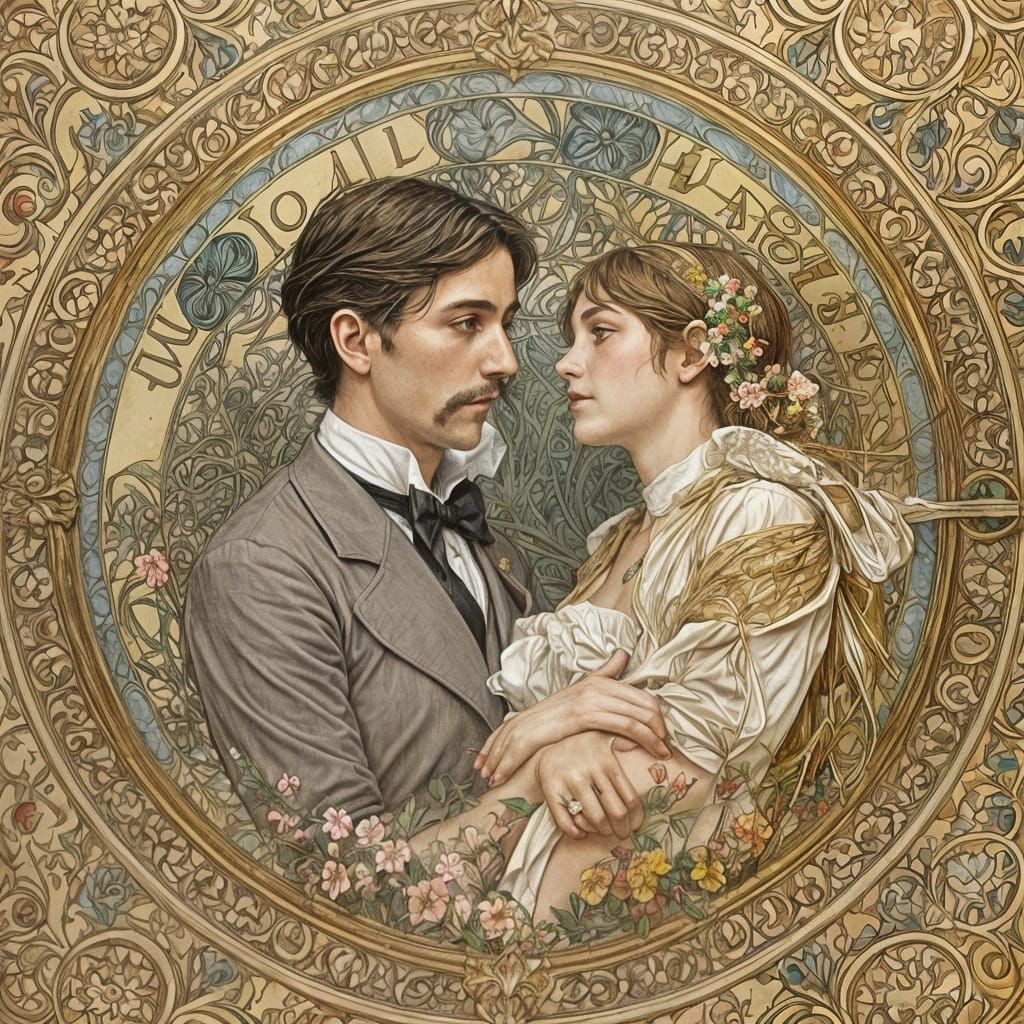 This image shows two lovers expressing their deep affection. The artwork is in an Art Nouveau style, reminiscent of Mucha, and features high detail and vivid colors.