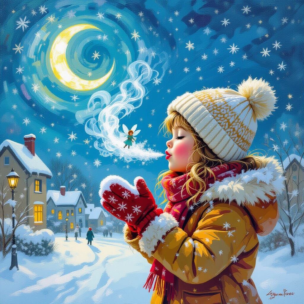A fantastical child blows a tiny fairy from her mitten into a snowy winter storm. Swirls of color and a crescent moon create a magical fairyland scene, rendered as a masterpiece digital painting.