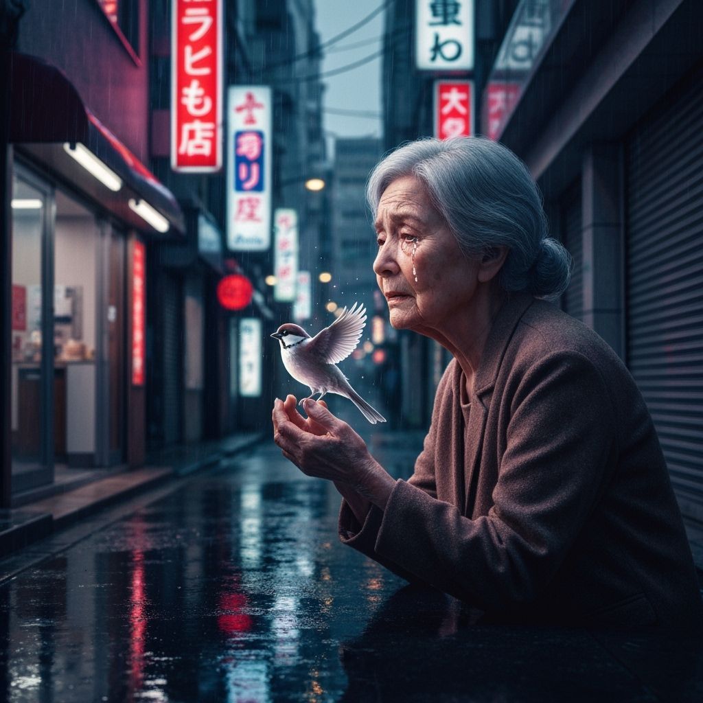 A striking picture of an elderly woman in a futuristic Tokyo alley, cradling a holographic sparrow. The image captures a cinematic scene with rich textures and dramatic lighting, in a cyberpunk aesthetic.