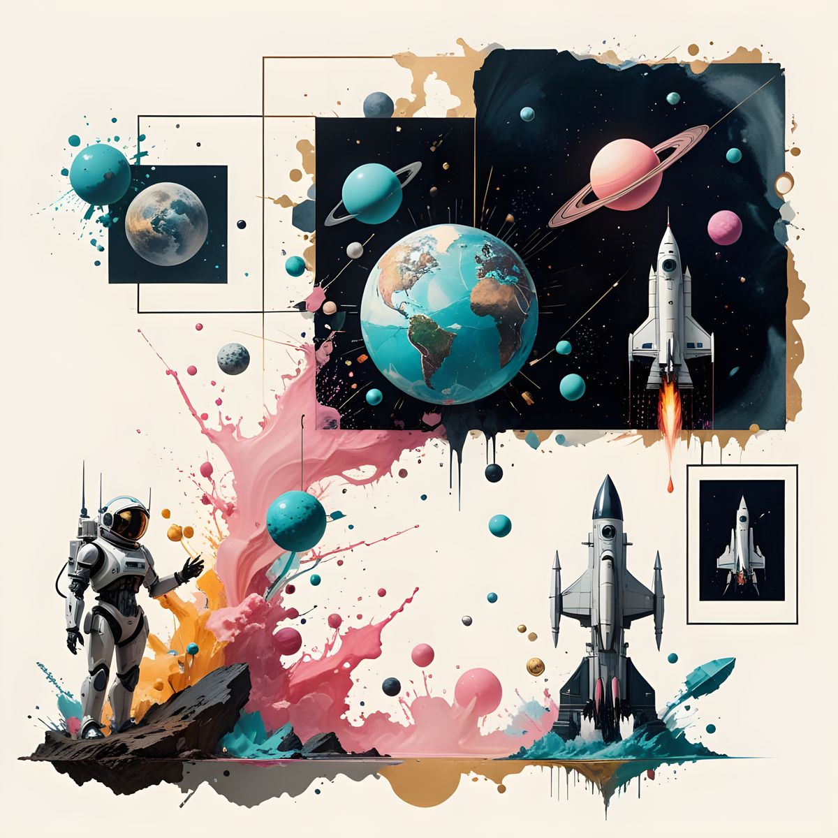 This image shows a vintage graphic collage featuring robots, rockets, and planets in a Bauhaus style. The artwork uses cut-out photos and geometric shapes with diluted ink washes and a pop art aesthetic.