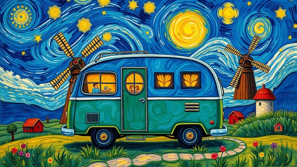 A vibrant camper van scene with ultramarine and ochre hues, inspired by post-impressionist paintings. The image evokes a joyful, dreamlike fantasy with bold brushstrokes and rich textures under a starry sky.
