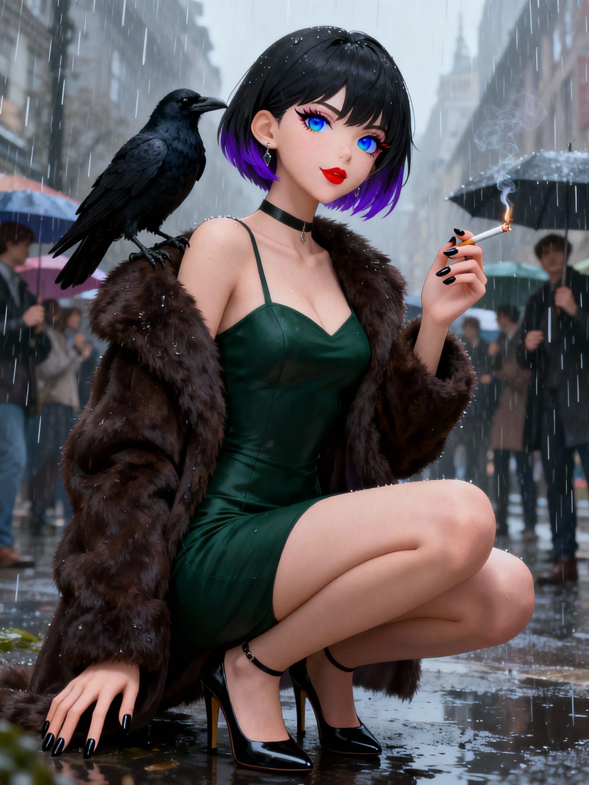 This image depicts a realistic anime-style young woman with short black hair and striking blue-green eyes. She wears a dark dress and fur coat, holding a cigarette as a raven perches on her shoulder against a dreary, rain-slicked city background.