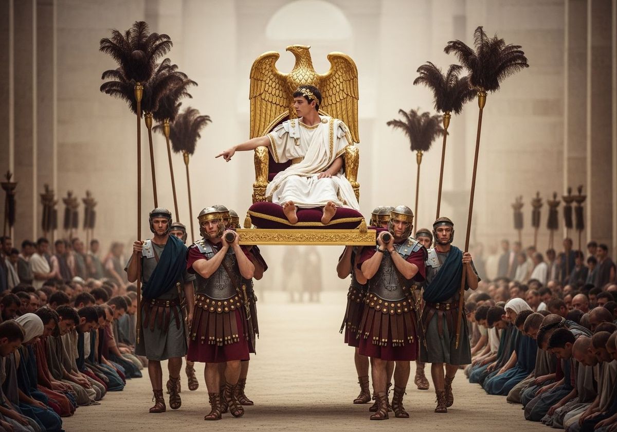 This image shows a young Roman emperor in an elaborate toga, carried on a golden eagle throne by soldiers. Kneeling peasants line the path as servants with feather fans attend him. The photorealistic image uses natural light and shallow depth of field.