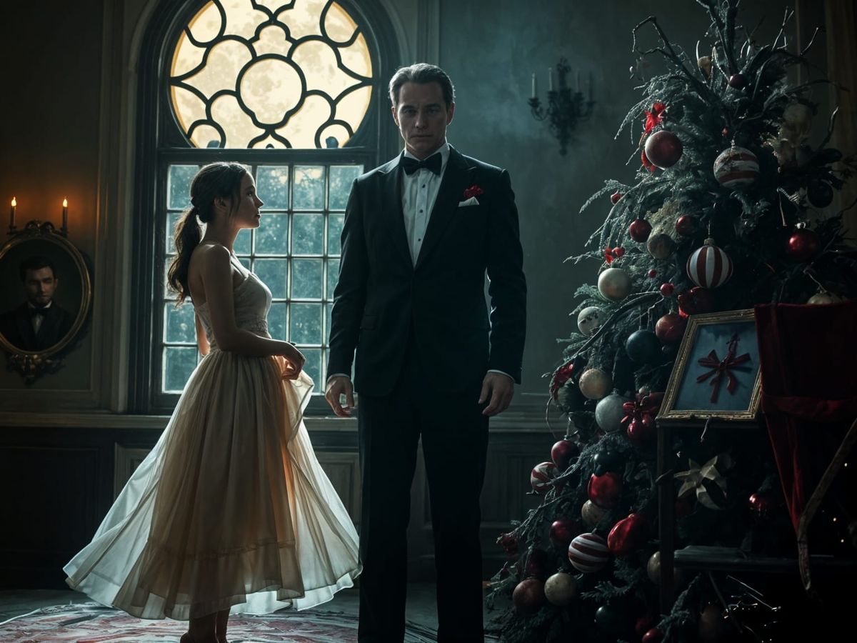 Photorealistic Gothic Nightmare in a Manor: An innocent looking young woman in a sun dress and a tall dark-haired neatly dressed man in a black and red tuxedo. Full moon seen through the window. Withered dying Christmas tree covered in broken ornaments.