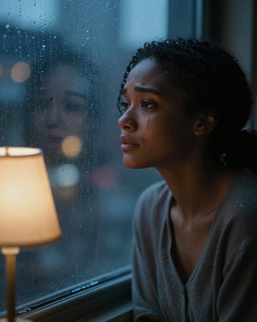 This image shows a young African American woman looking out a rain-streaked window, with city lights reflecting. Shot with a shallow depth of field, it has a moody, cinematic feel.