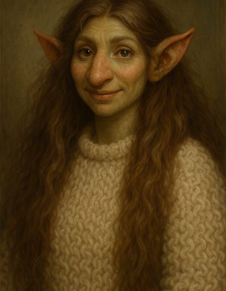 This image shows a female troll with long hair wearing a wool jumper. The troll has a slightly cartoonish style and is set against a neutral background.