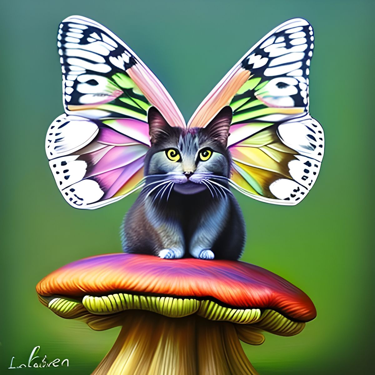 This image shows a beautiful, detailed cat with butterfly wings perched on a mushroom. The artwork is highly detailed and intricate, with photorealistic elements rendered in natural light.
