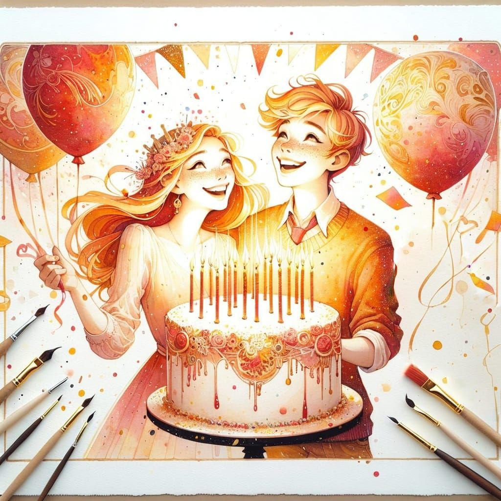 A hand-drawn watercolor illustration of two happy friends, Rosalie and David, celebrating their birthday with cake and balloons. This whimsical art features a vibrant color palette in an Art Nouveau style.