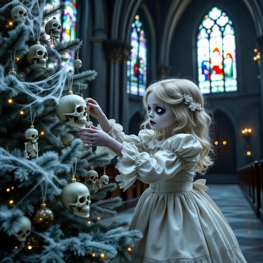 This photorealistic image captures an undead girl in a tattered dress adding a skull to a ghoulish Christmas tree inside a dimly lit gothic church. The scene is rendered with a 35mm film aesthetic, featuring shallow depth of field and volumetric lighting.