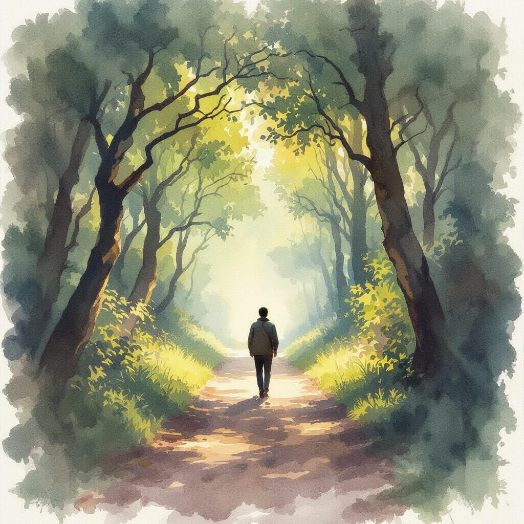 This image shows a solitary man on a narrow forest path rendered in a loose watercolor style with visible brushstrokes. Lush trees obscure the path's end, with dappled light creating a dreamy, atmospheric quality.