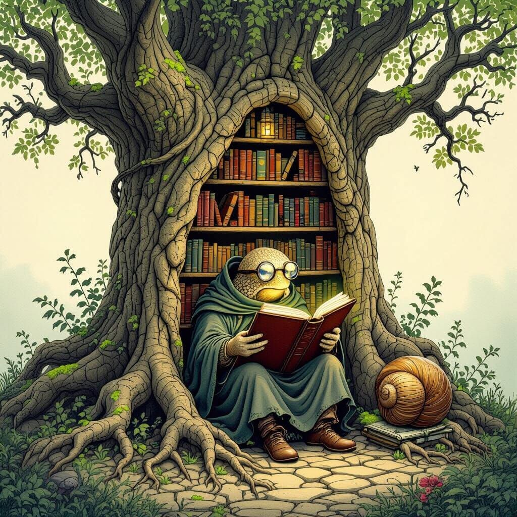 A captivating image of an ancient tree concealing a secret library within its trunk, in a painterly style. The scene is reminiscent of classic fairy-tale illustrations with intricate details.