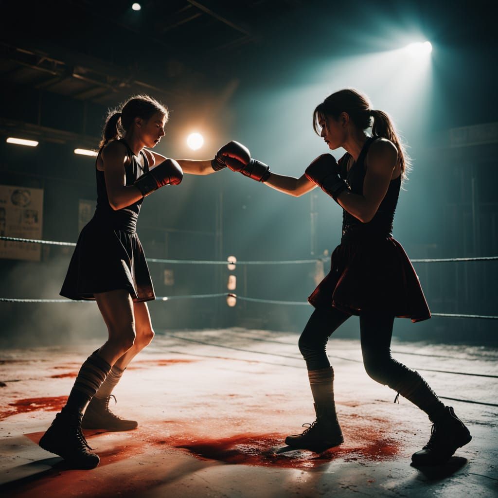 This image is a cinematic film still of two women in a intense fight, with vibrant colors and high contrast, set in a dramatic atmosphere with dynamic camera movement.