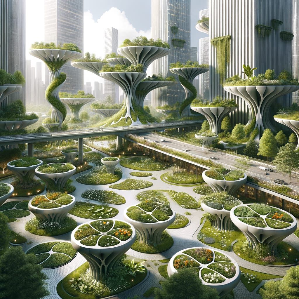 This image shows a futuristic urban park blending nature and architecture. Green roofs and climbing plants enhance biodiversity. The scene features petal-shaped flower pots scattered throughout the landscape.