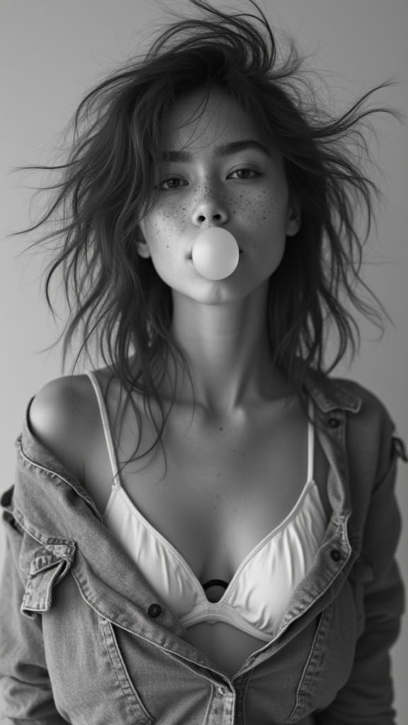 A striking picture of a young woman blowing a bubble. The portrait, rendered in monochrome, captures a cinematic moment of youth and defiance with hyperrealistic detail and soft, directional lighting.