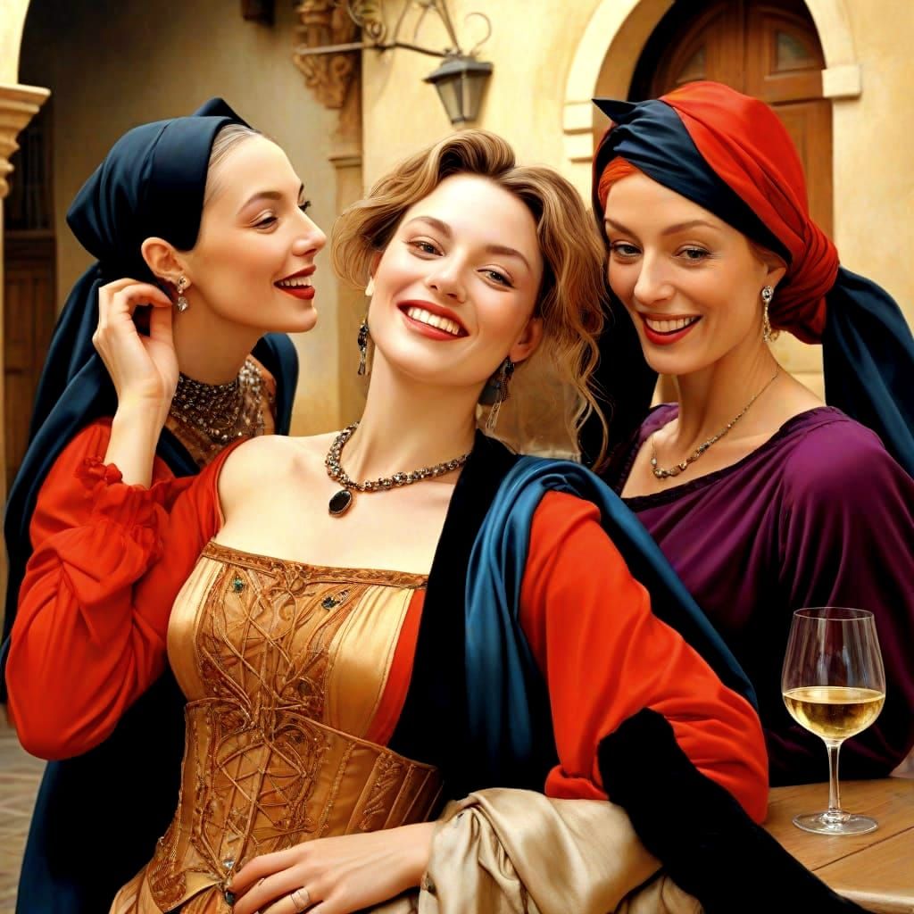 beautiful mature medieval ladies drinking wine and laughing in medieval courtyard, black cats at their feet