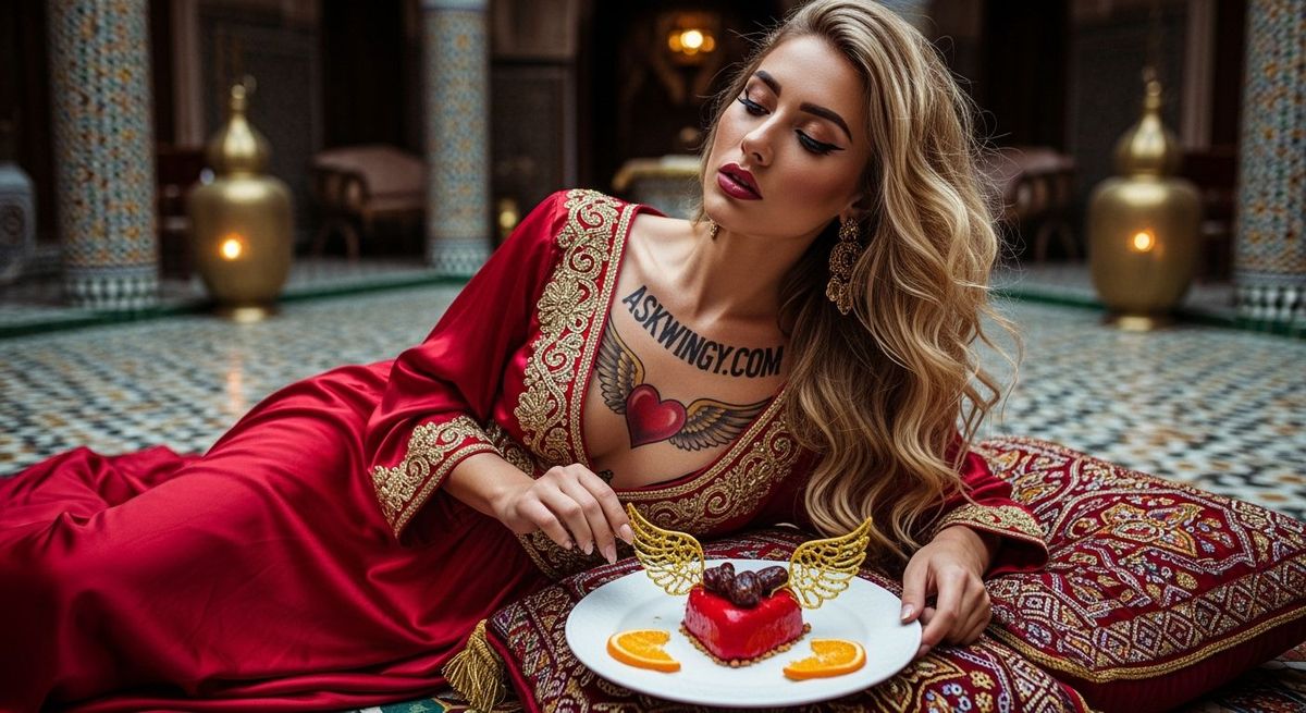 Photorealistic cinematic still of a blonde woman on embroidered cushions in a Moroccan riad. Mosaic tiles and lanterns create a warm glow. She wears a crimson silk gown.