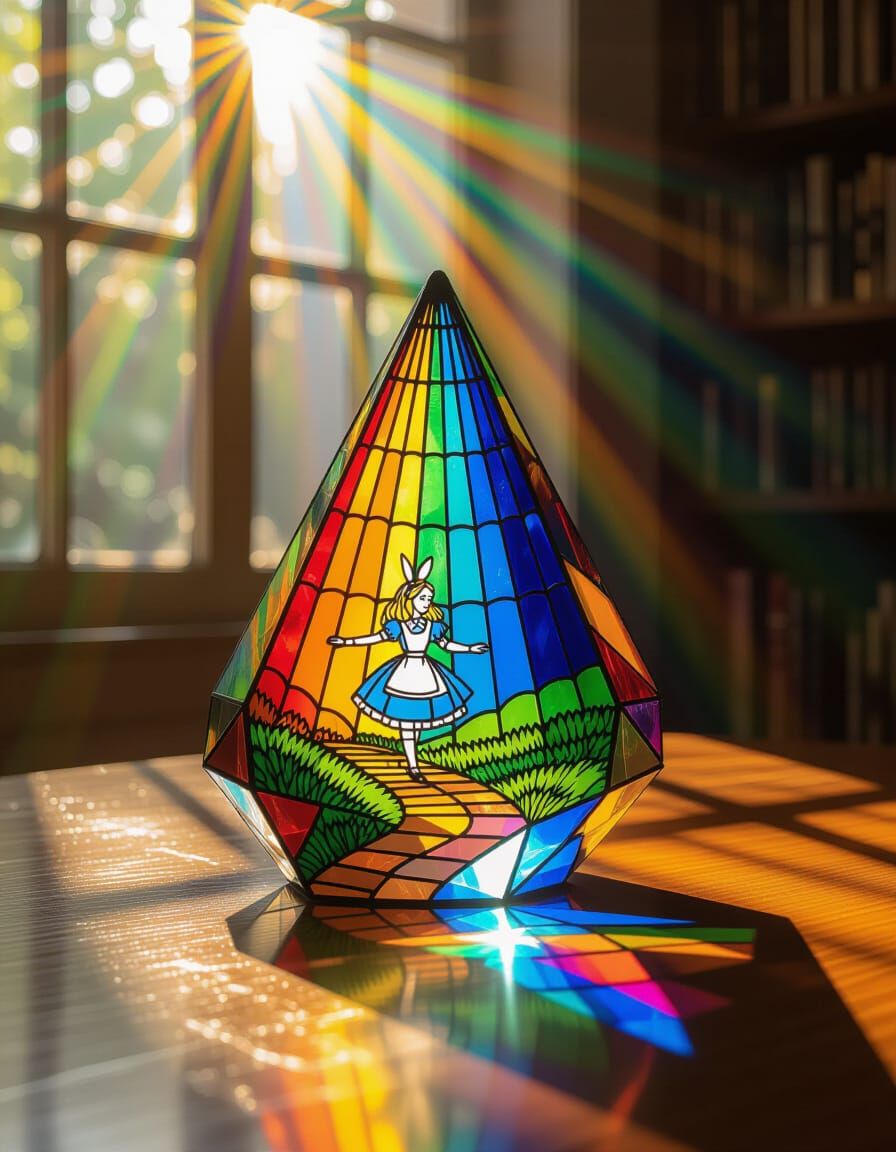 Stained glass art. Close-up shot. A prism sits on a table, bathed in sunlight, casting a vibrant rainbow across a detailed recreation of Alice in Wonderland falling down the rabbit hole. The colors are vivid and intense, creating a mesmerizing display of light and color. The style is reminiscent of classic ...