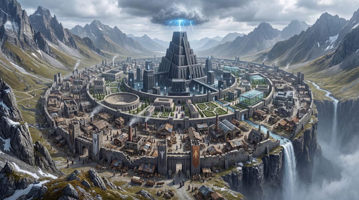 This image shows a highly detailed view of an ancient city nestled within a horseshoe-shaped alpine basin, built before the great flood. The city dramatically overlooks a misty abyss.
