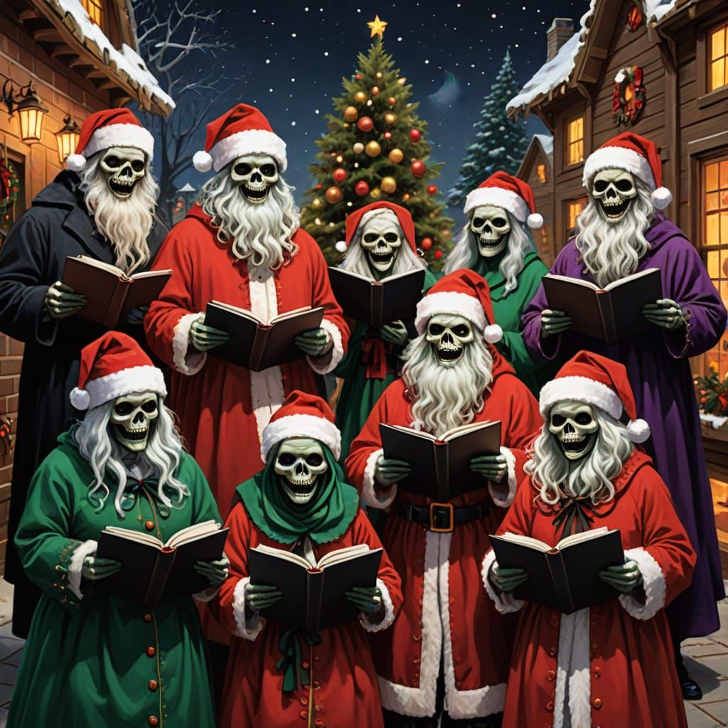 This image displays ghouls dressed in holiday attire, cheerfully singing traditional Christmas songs. A unique and spooky take on a festive scene.