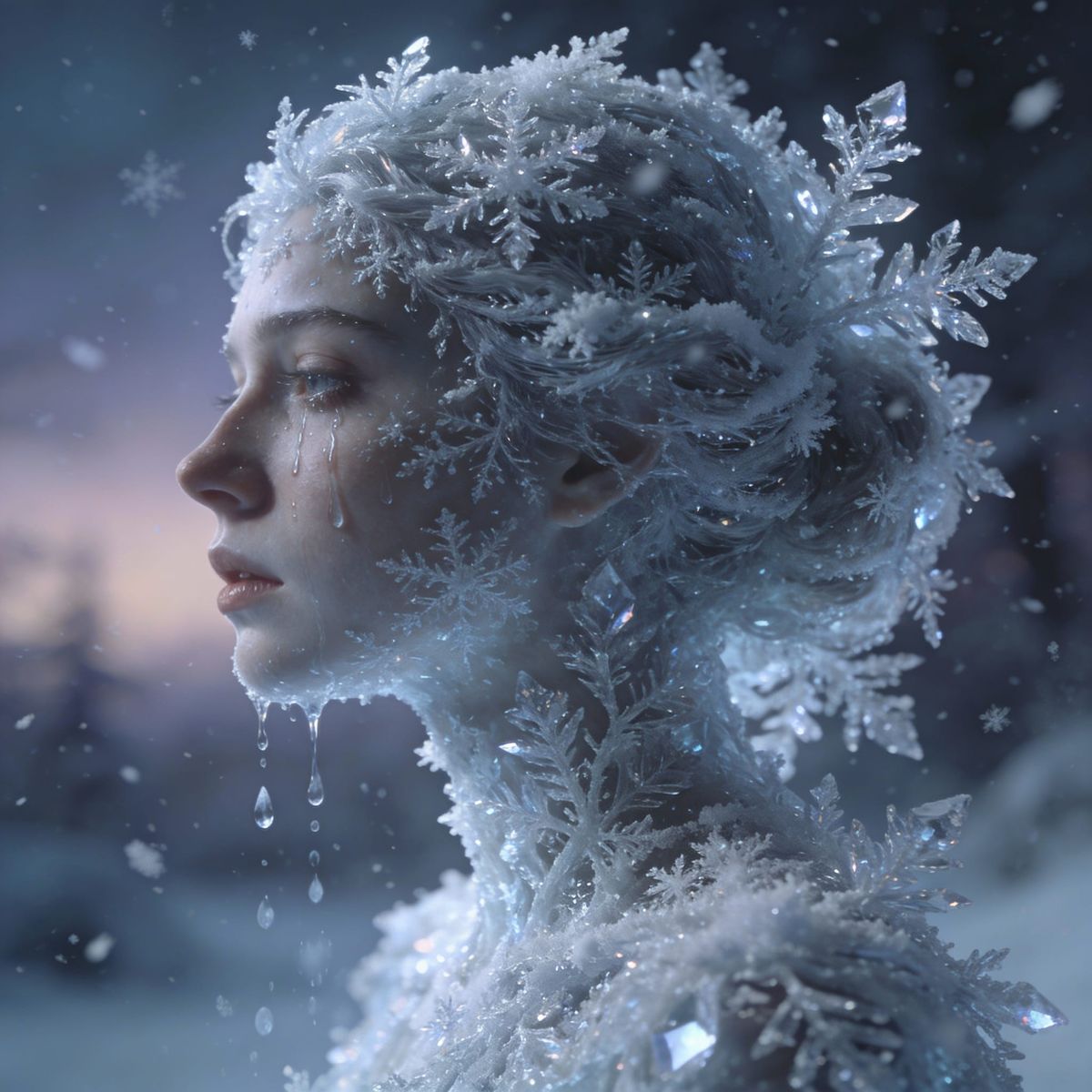 This image shows a detailed portrait of a woman made of frost and snowflakes, crying tears that melt into snow. The scene has a soft, magical winter twilight atmosphere.