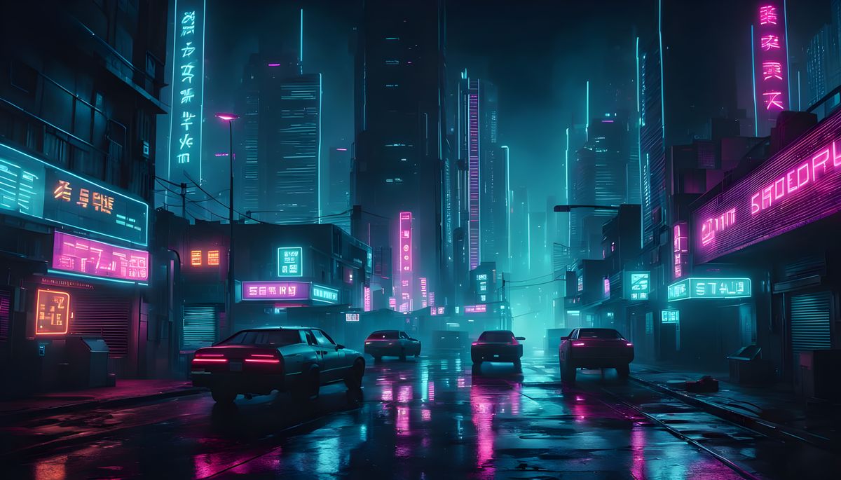 This image depicts a futuristic cityscape at night, reminiscent of Blade Runner and Metropolis. The scene features ambient night lighting, atmospheric shading, and a synthwave neon retro aesthetic.