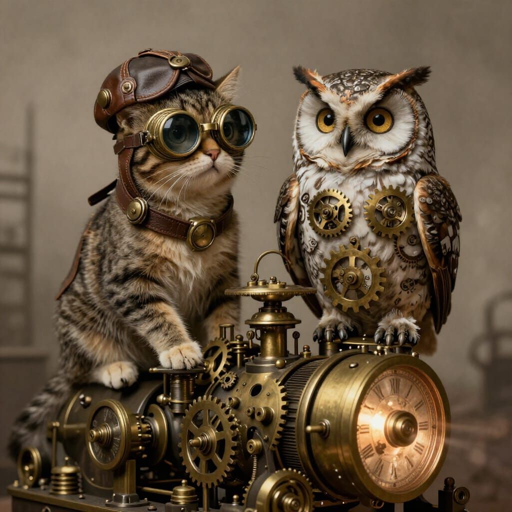 Easily create unique steampunk cat and owl images for free with our AI generator. Unleash your imagination!