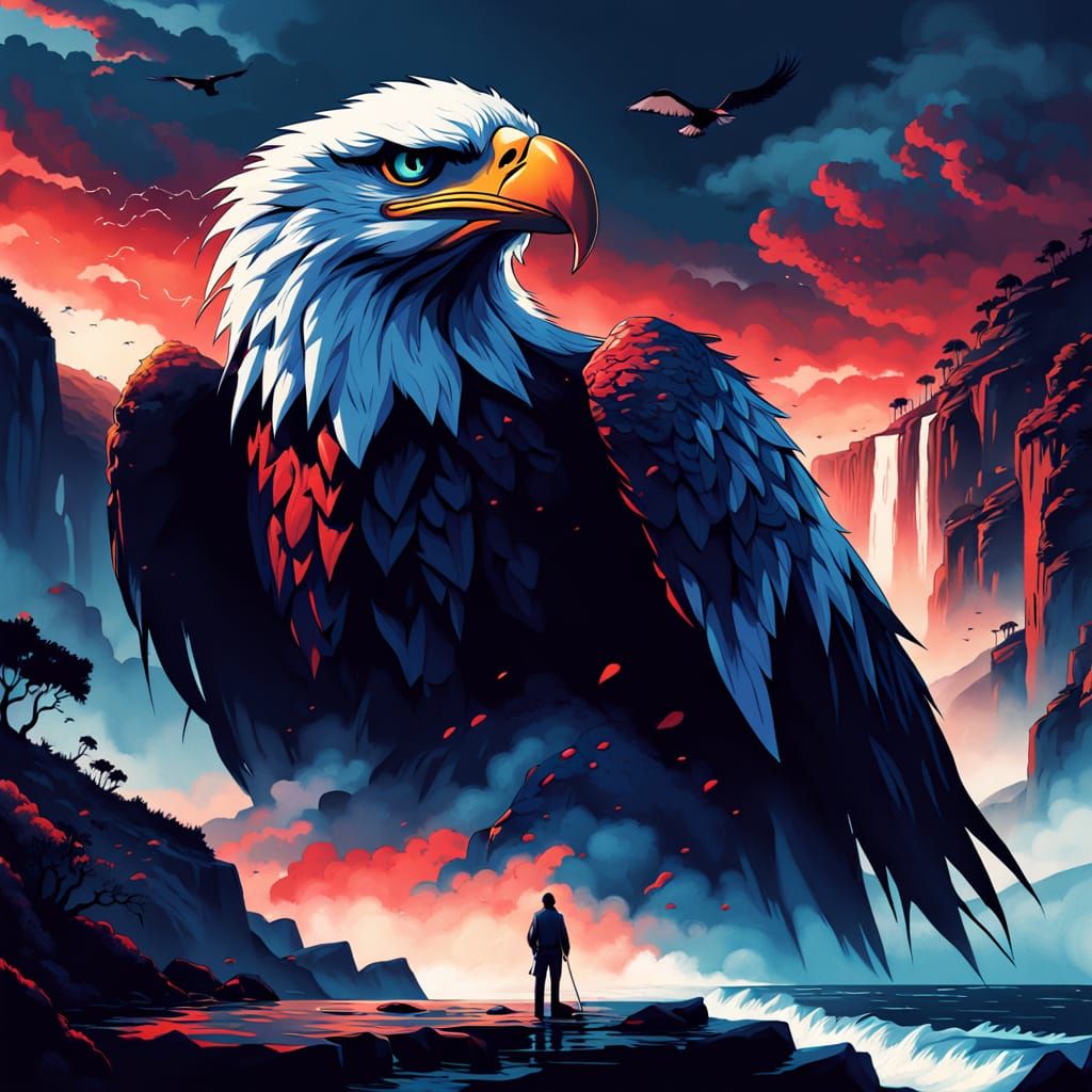 A cinematic film still captures the intense emotional drama of Soul Stealer and Look of Penance standing on a cliff overlooking Malibu, as eagles soar in the background and a blood-red waterfall cascades down the cliffside, set against a backdrop of serene blues and ominous atmosphere.