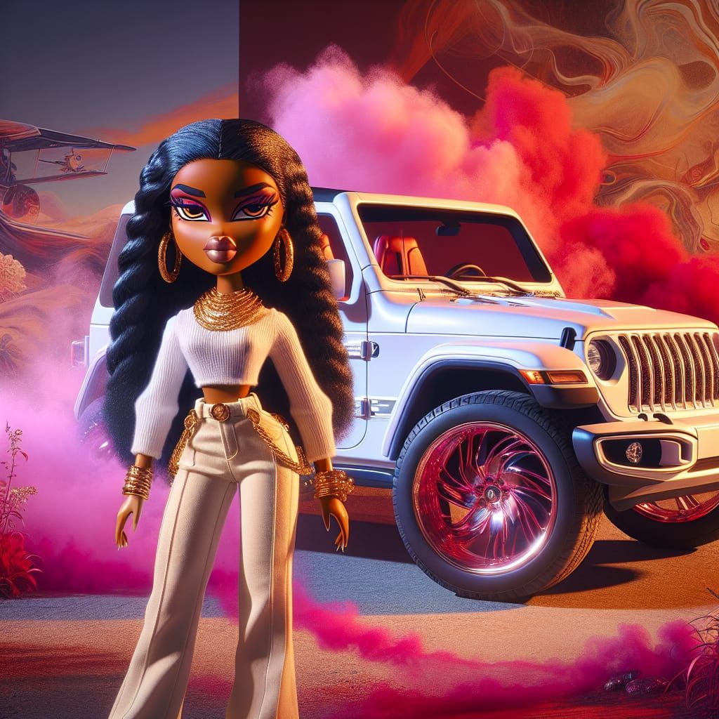 A striking image of an African American Bratz-style doll with curves and long hair, adorned with gold jewelry and makeup. The doll stands before a white Jeep with red interior, set against pink and red smoke, rendered as detailed matte fantasy concept art.