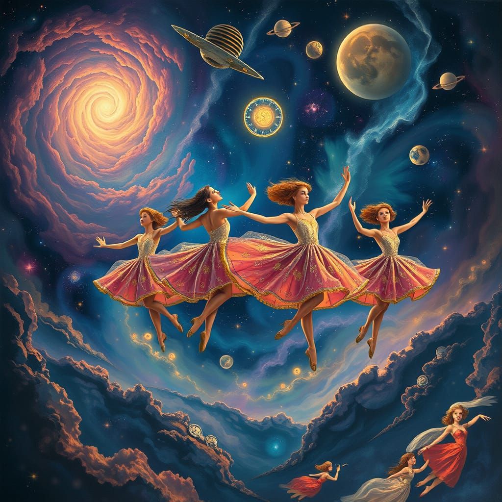 This image shows ethereal time travelers in clockwork attire, pirouetting through swirling galaxies. Rendered in a surreal dream-fantasy art style with soft, luminescent lighting.