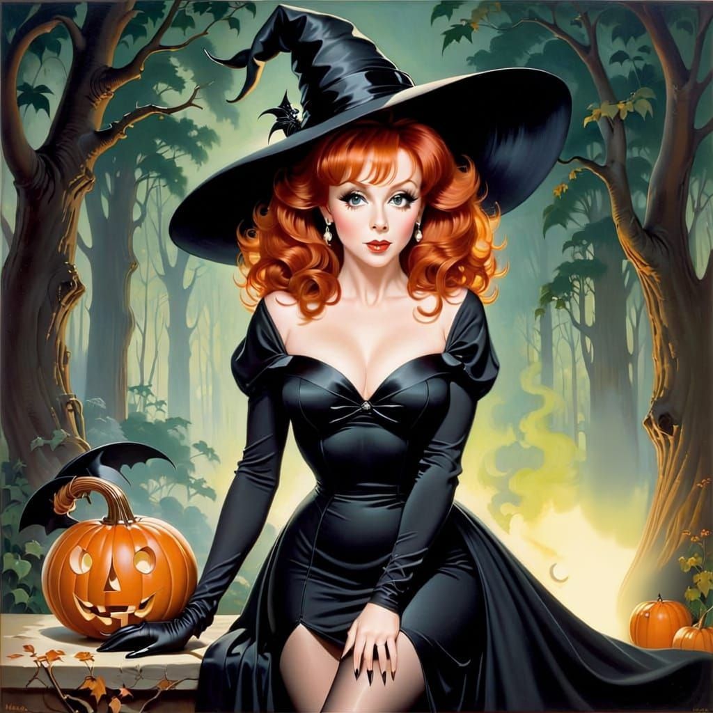 This image features a whimsical, retro oil painting of Reba McEntire dressed as a witch for Halloween, complete with a pointy hat and black gown, rendered in an impressionistic style.