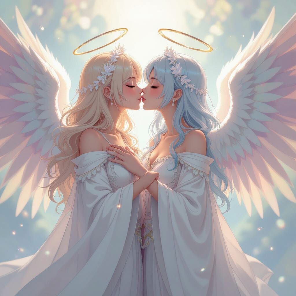 This image shows two humanoid angelic digimon in a tender kiss. The figures have iridescent wings and halos, and are draped in flowing robes, rendered with a soft, dreamy anime aesthetic.