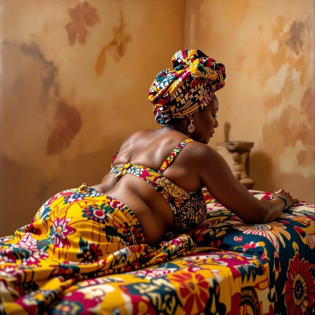 This image shows a mature Igbo woman enjoying a back massage. The scene is set in a warm, inviting atmosphere with artistic brushstrokes and vibrant African patterns. The artwork evokes a contemporary African aesthetic.