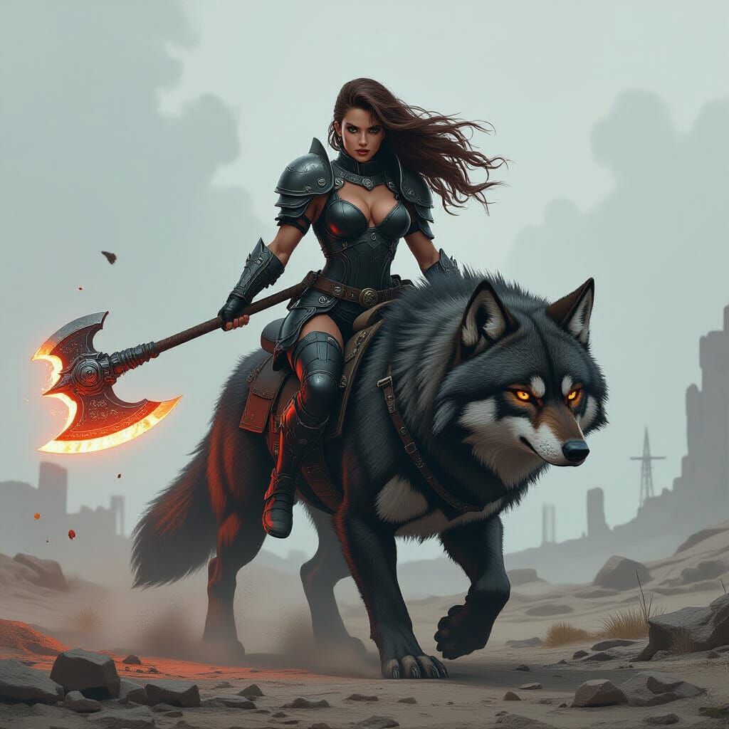 This image shows a genetically enhanced female warrior with an energy axe riding an armored wolf through a post-apocalyptic wasteland. The digital art features bold colors, film grain, and cinematic lighting.