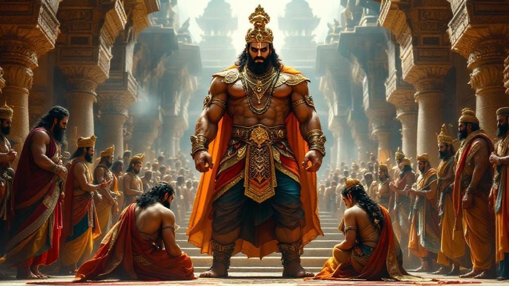 This image shows King Kansh in an ancient Indian palace. The king wears a crown and sehra, while Queen Devaki and King Nand bow before him. The artwork blends traditional and digital media in a cinematic style.