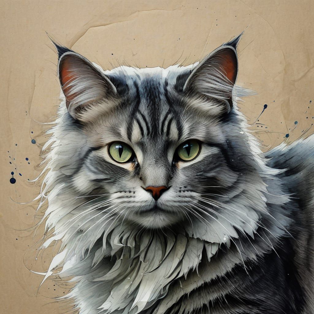 A surreal watercolor painting of a fluffy gray cat in double exposure. The artwork features a muted palette and combines multiple techniques, creating a highly detailed and high-quality image.
