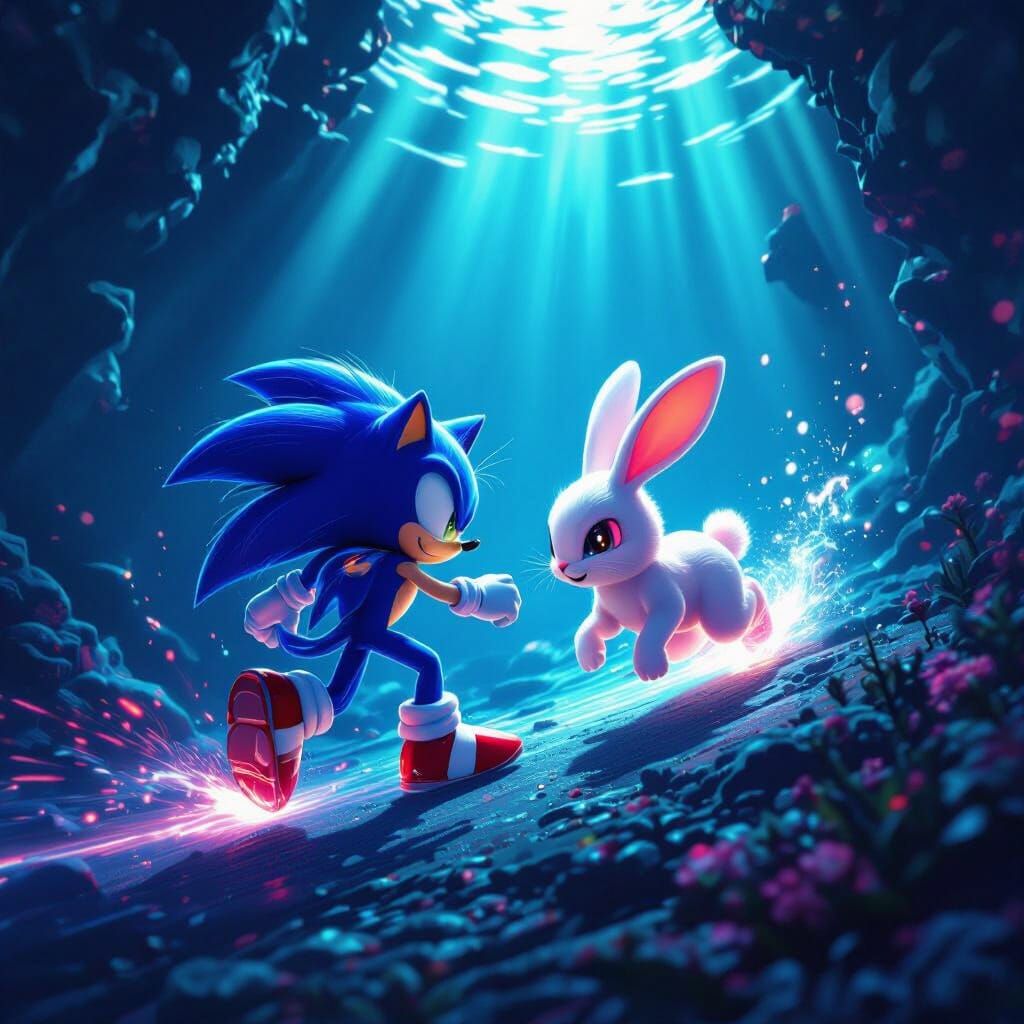 This image shows Super Sonic running with a glowing deep-sea bunny in a dark abyss. Dynamic motion blur and vibrant light shafts create a cinematic, hyperrealistic digital art scene.