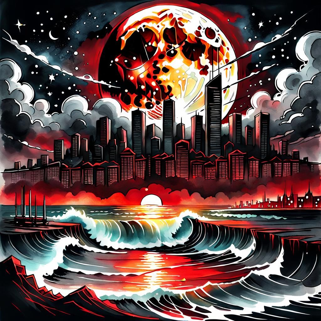 A dramatic image of a ruined city beneath a blood moon. The night sky glitters with stars above crashing waves, all rendered with chiaroscuro in a dark red and black palette.