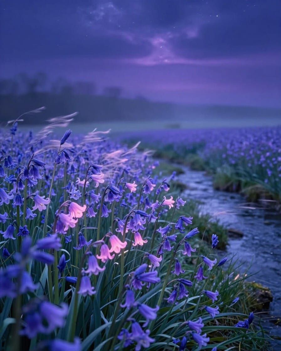 This image shows a field of colorful bell flowers beside a stream under a beautiful night sky, rendered with soft lighting and deep colors in an idyllic style.