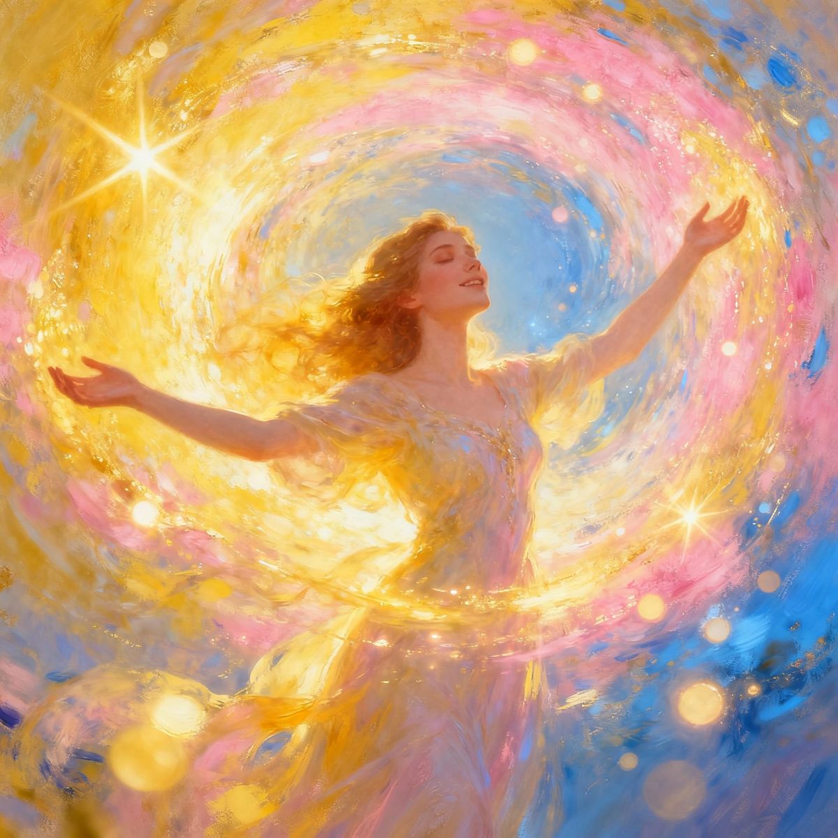 This image shows a radiant woman embracing a vortex of glowing memories with golden light flares and bokeh. Rendered in a dreamy digital painting style with a soft, warm color palette, evoking nostalgia and joy.