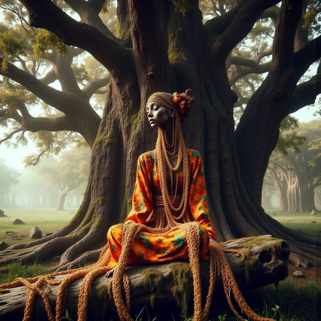 This image shows a longneck woman in traditional dress sitting beneath a baobab tree. She wears golden chains around her elongated neck, illuminated by warm sunlight in a whimsical, realistic style.