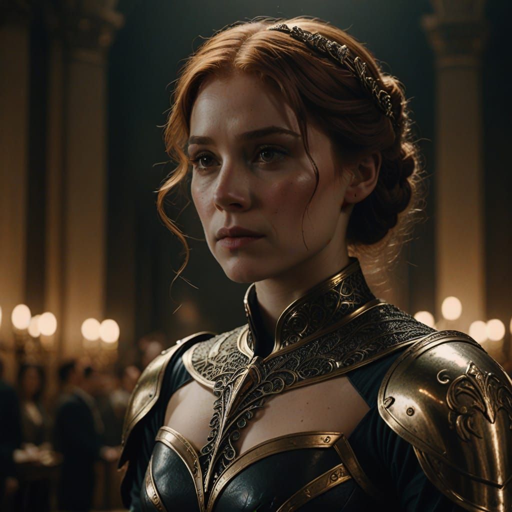 This cinematic portrait of a regal English princess features warm, moody lighting and a rich, dark color palette. With short, cropped ginger hair and brown eyes, she exudes confidence and elegance in a stunning, heroic image with a 35mm film aesthetic.