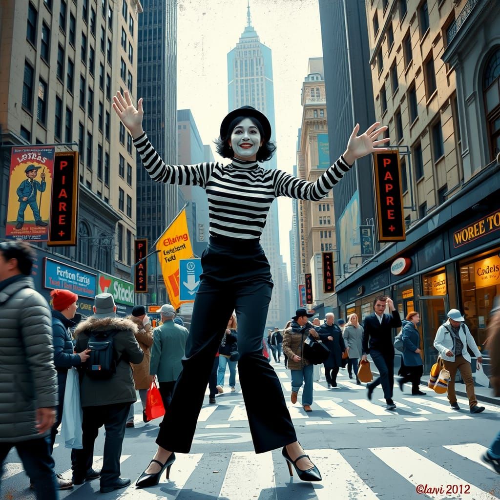 This image shows a female mime artist performing in a downtown New York setting. The scene captures the essence of street performance.