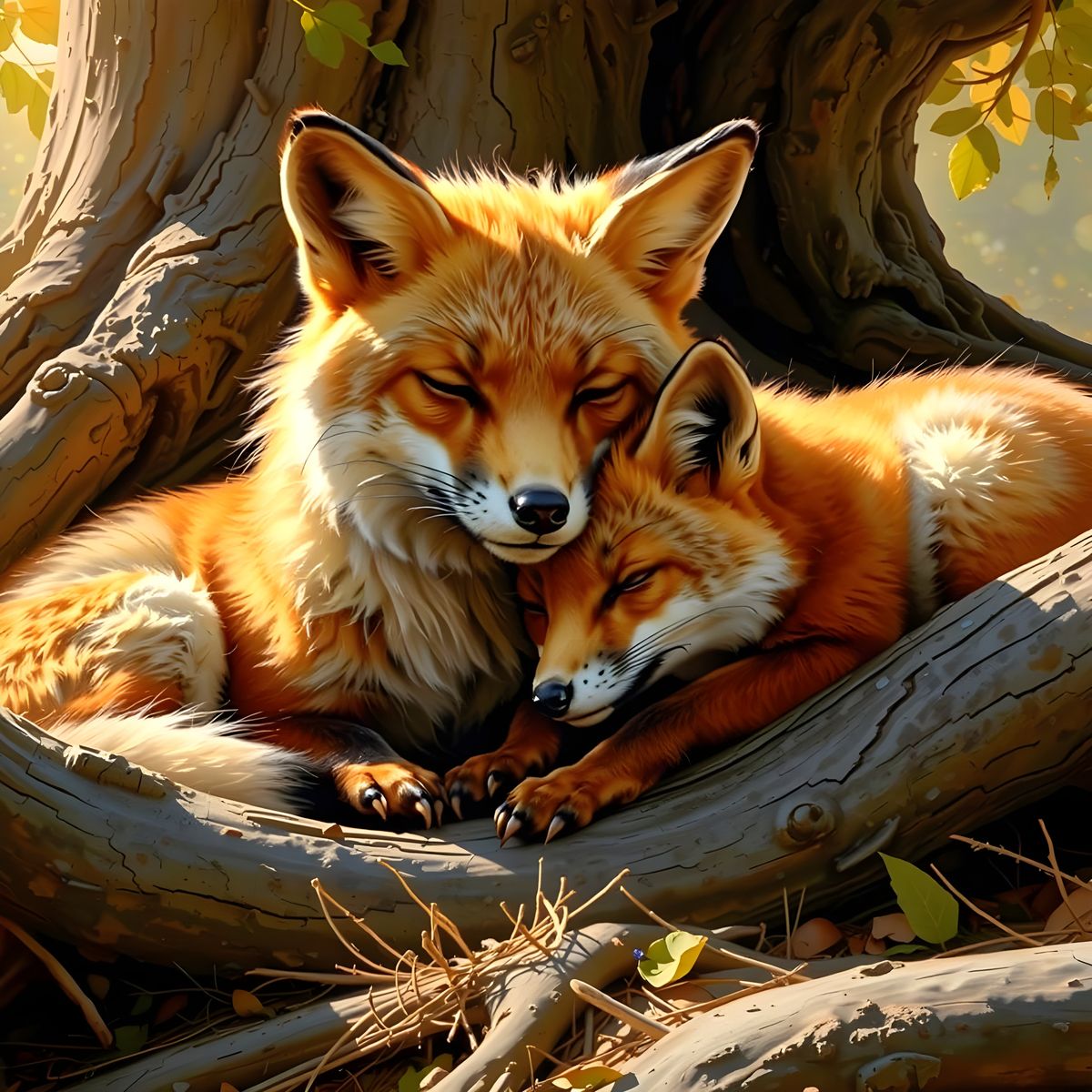 A tender image shows a mother fox asleep with her baby beneath an old tree. The picture captures a surreal, dreamlike atmosphere reminiscent of delicate watercolor illustrations.