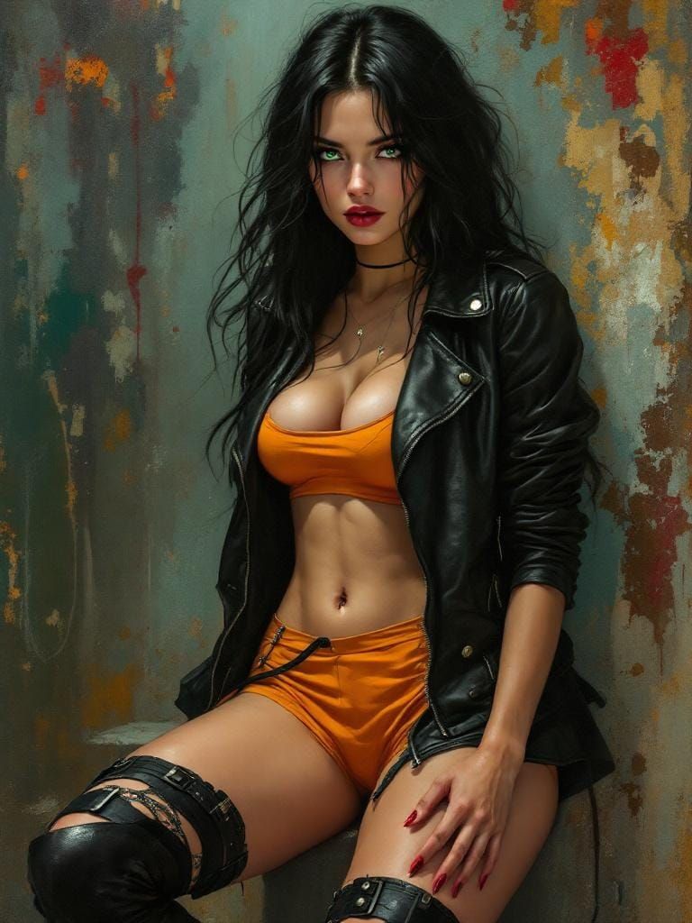 A portrait of a young woman with green eyes, black hair, and a leather jacket standing on a city street. The portrait is rendered with idealized naturalism in an art nouveau style.