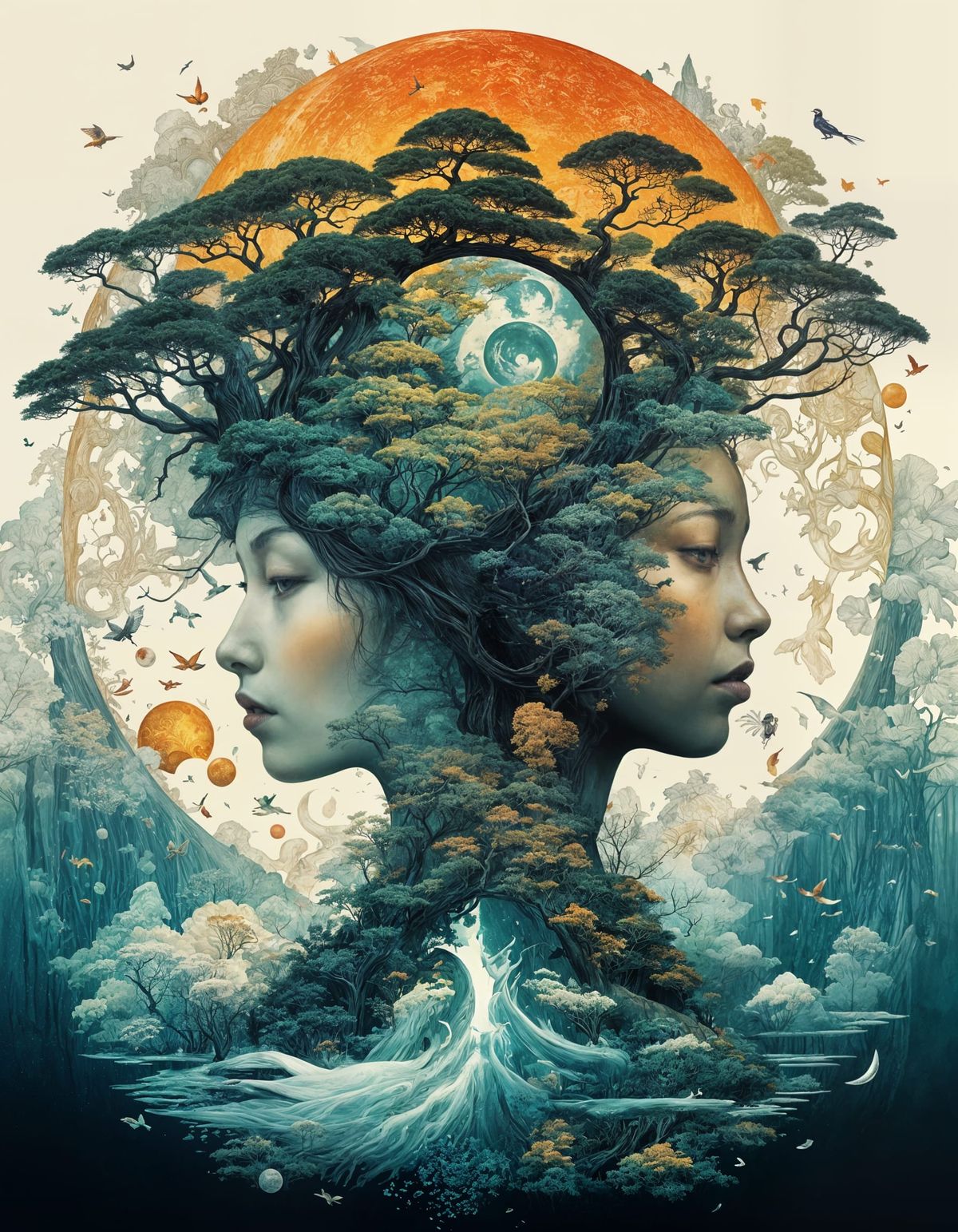 A striking image of a dual-headed female spirit embodying yin-yang harmony. The composition balances summer and rain, intricately detailed with merging worlds and symmetrical elements in a maximalist style.