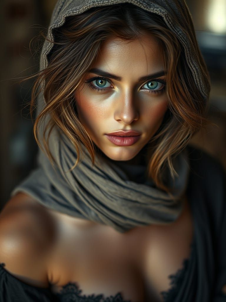 A hyper-realistic portrait of a beautiful woman with light hazel eyes and natural skin texture, captured with cinematic lighting and sharp focus for a lifelike appearance.