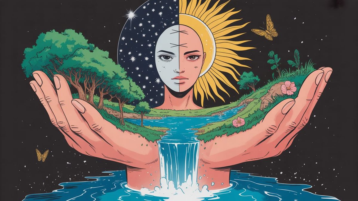 This image shows a giant goddess in a surreal double exposure composition, holding a vibrant landscape in her hands. Rendered with textured brushstrokes and glitchcore elements, the scene features celestial and natural motifs.