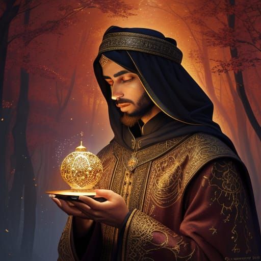 A striking picture of a young scholar in an enchanted forest. He reaches out to a mythical songbird in a painterly scene of glowing roses and soft shadows, with intricate embroidery and celestial patterns in a luminous palette.